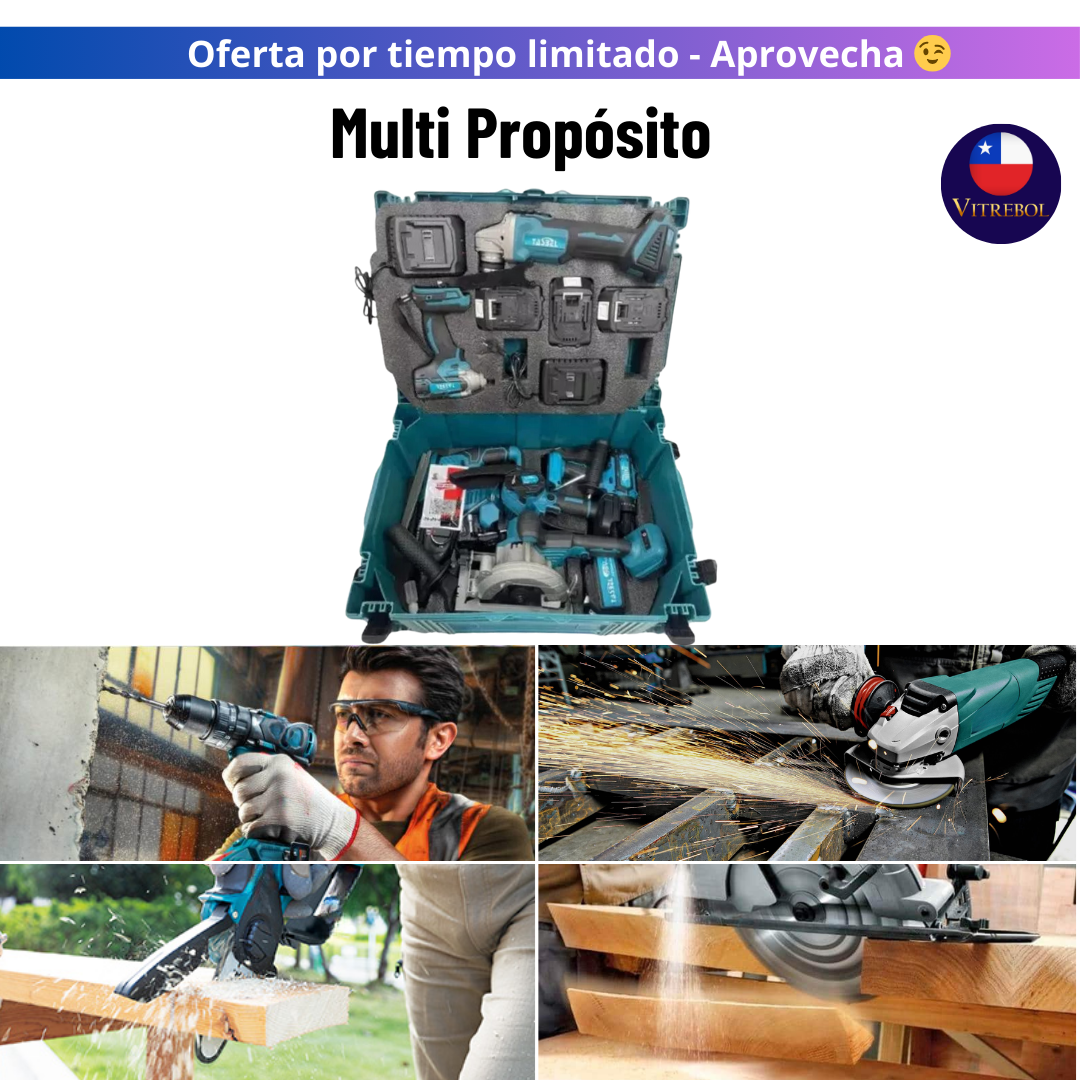 Cada herramienta viene equipada con una batería potente de litio, garantizando una duración prolongada para sesiones de trabajo continuo. Incluye 4 baterías y 2 cargadores para mantener tu equipo siempre listo.