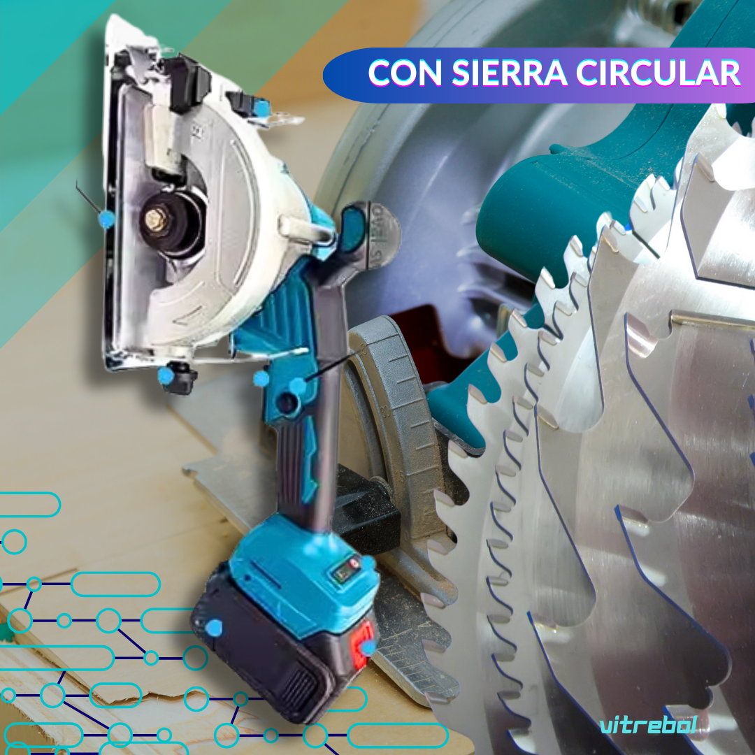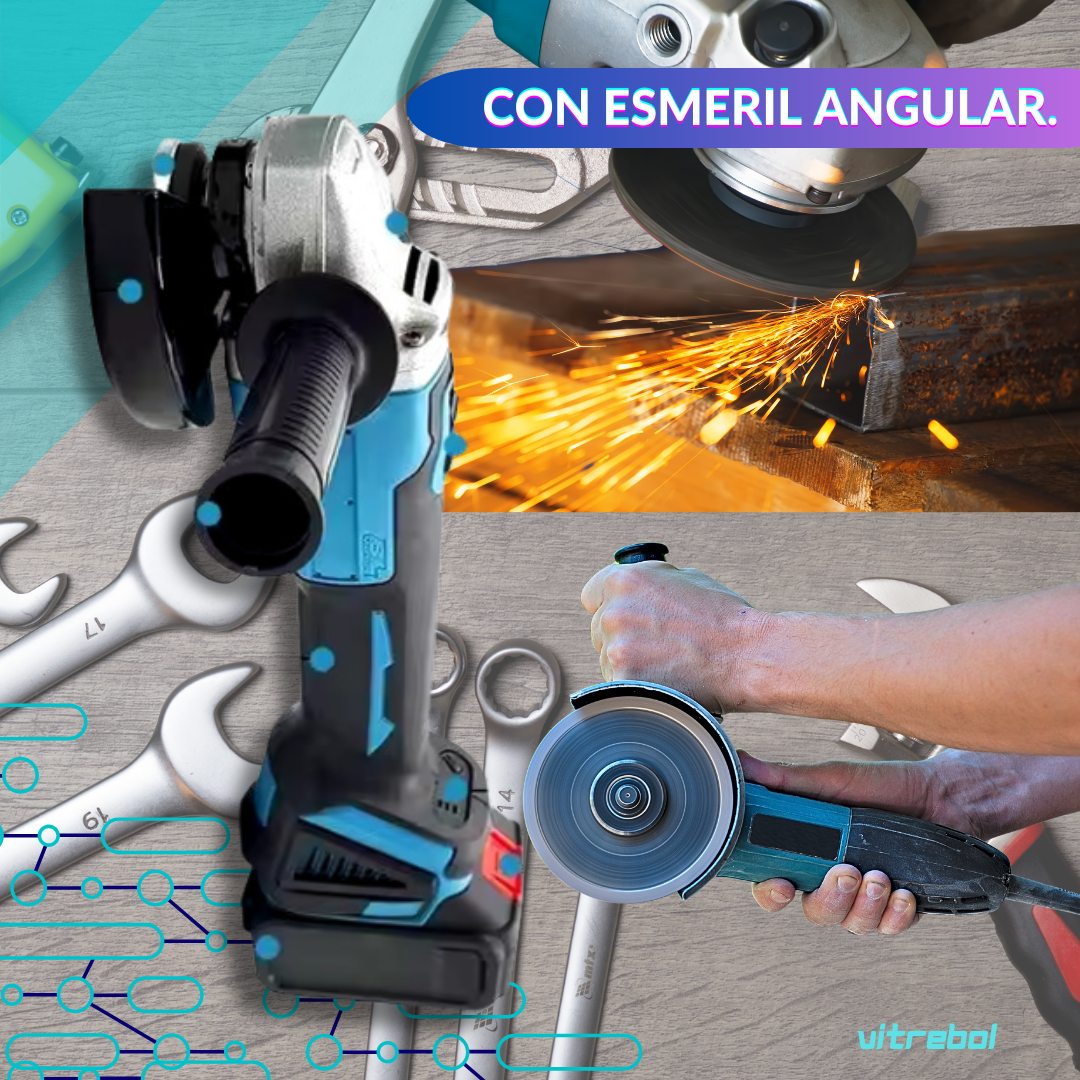 - Incluye taladro eléctrico, llave de impacto, esmeril angular, taladro percutor, mini sierra y sierra circular.